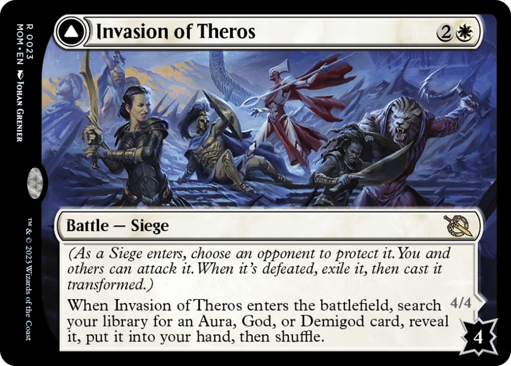 Tutors are always very powerful cards. Invasion of Theros is a slightly niche tutor, but one . For three mana, Invasion of Theros allows its controller to search their deck for an Aura, a God, or a Demi-God. There are several decks that might want this effect. Aura and Enchantment focussed decks are naturally the perfect home for it, alongside God tribal decks built around effects like The World Tree. Decks looking to abuse the infinite combo of Heliod, Sun Crowned, and Walking Ballista can use this card to fetch one of the two combo pieces.