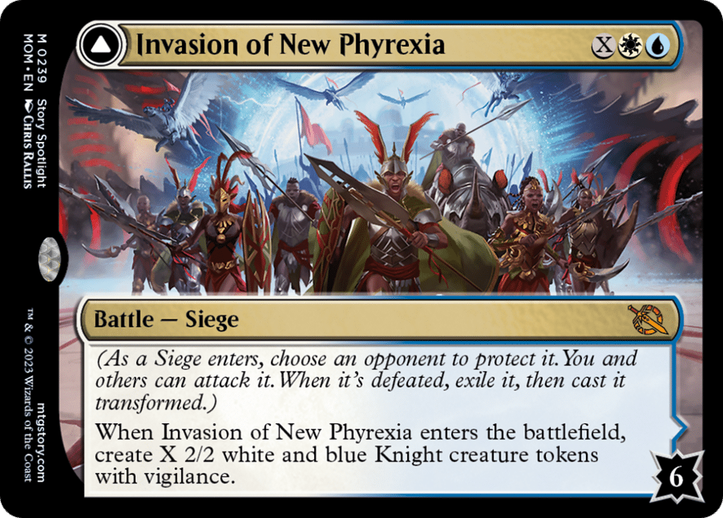 Invasion of New Phyrexia is a hugely powerful card. Finale of Glory and White Sun’s Zenith are both pretty strong cards, but In Azorius decks, Invasion of New Phyrexia puts them both to shame. Not only do the tokens generated by Invasion of New Phyrexia have Vigilance, but it also has the ability to transform into a really good Planeswalker. Although this battle has six defense, the huge army of Knights you will have created as you play it should have no trouble tearing it down.