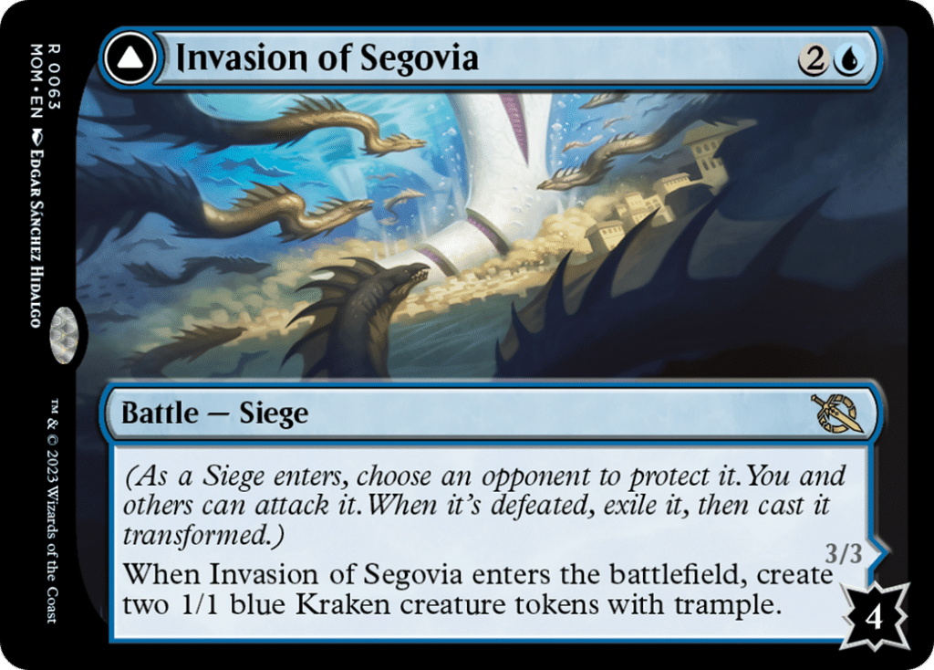 Invasion of Segovia is another battle that really needs to transform for you to get the most out of it. It has a very mediocre front side, generating two 1/1s for three mana. Once it has been transformed into Caetus, Sea Tyrant of Segovia, however, it becomes very powerful. Caetus grants all non-creature spells in its controller’s deck Convoke and untaps up to four creatures during each of its controller’s end steps. This provides a huge discount on powerful late-game spells like Expropriate and Cyclonic Rift.