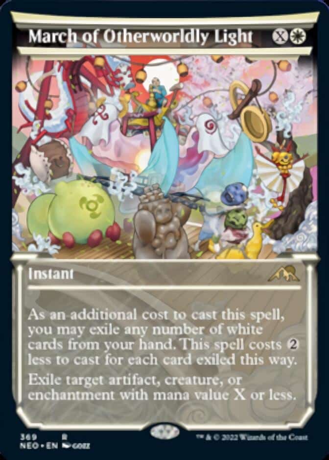 March of Otherworldly Light is a pretty versatile removal spell. It’s instant speed, and you can exile white cards from you hand to scale up the mana used for the spell.