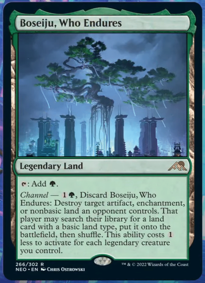 Boseiju, Who Endures, is so good, I am nervous about how it will affect Modern. Between Wrenn and Six and Life from the Loam, you can return Boseiju from you graveyard to your hand to repeatedly blow up your opponents artifacts, enchantments and nonbasic lands every turn.