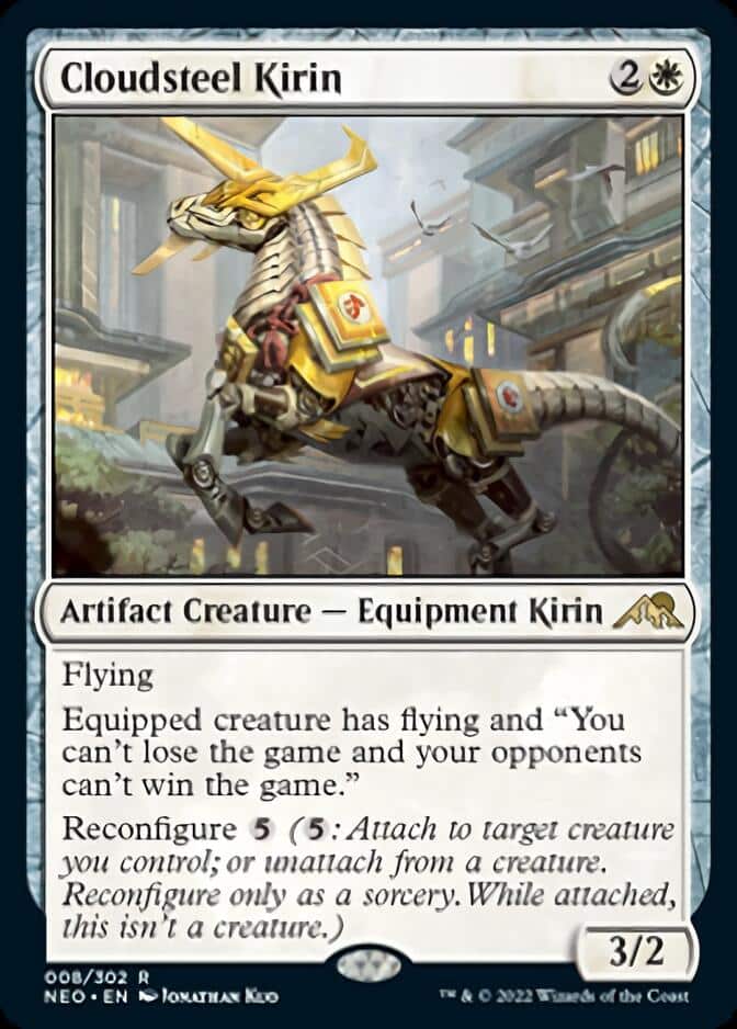 Sigarda’s Aid is one such loophole to equipping Colossal Hammer for free. The one-mana enchantment also synergizes with Cloudsteel Kirin. You can flash the new Reconfigure spell linto play and automatically equip it to a creature. As long as that creature remains on the battlefield, you can’t lose the game.