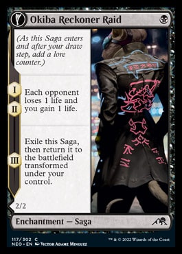 For one mana, Okiba Reckoner Raid drains your opponent for two and transforms into a 2/2 with menace. That’s an aggressive MTG card!