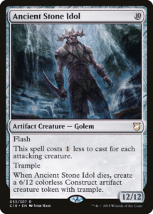 Ancient Stone Idol is a bizarre Commander card that rewards players for going wide and attacking with many creatures. You can even play the Stone Idol for free if you have enough attacking creatures. The reward that awaits you is a gigantic 12/12 creature that cannot be blocked efficiently and leaves a body behind after it falls.
