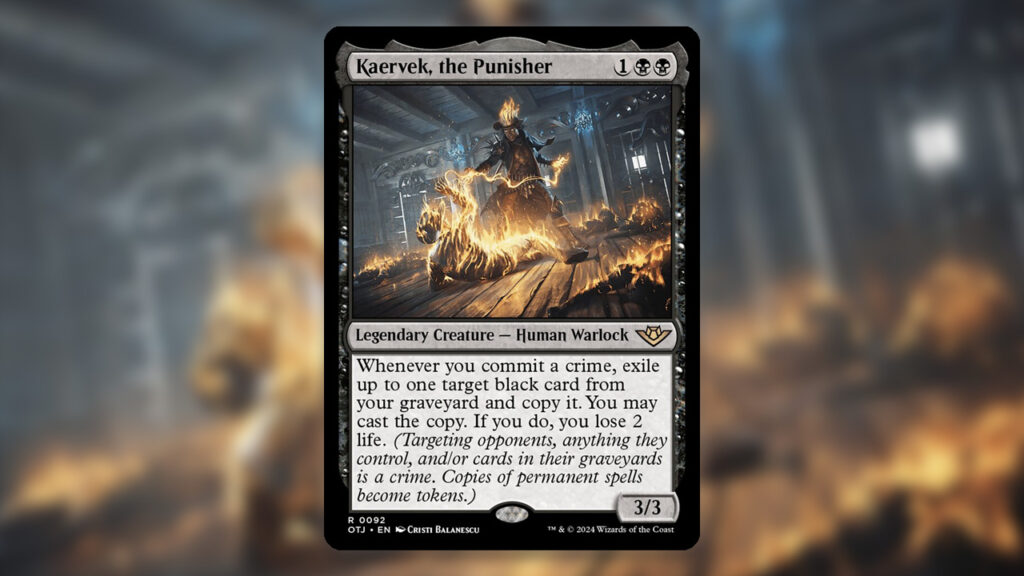 Kaervek is another card in a line of Crime-related payoffs from Outlaws of Thunder Junction. Committing a Crime in Magic may be a little too easy, since it only involves targeting an opponent’s stuff. Should you do so, Kaervek allows you to exile a black card from your grave, copy it, and cast the copy.