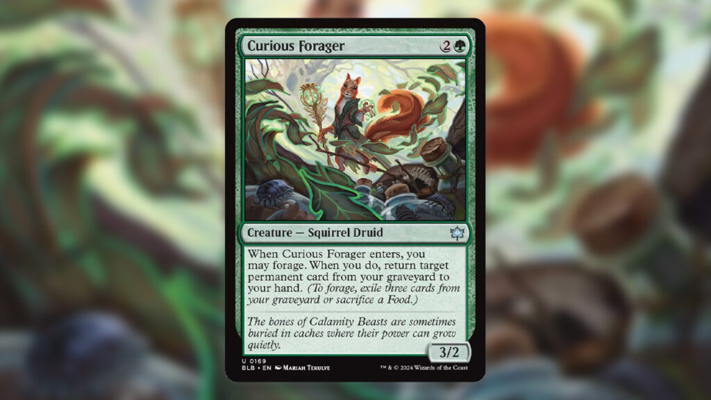 To recap, Forage is a new mechanic commonly found on Squirrelfolk in the world of Bloomburrow. If you can pay the Forage cost of either exiling three cards in your graveyard or sacrificing a Food Token, you can get an additional payoff. In this case, Curious Forager allows you to return a permanent card from your grave to your hand. Considering that this is generally pure card advantage, the payoff to Curious Forager is usually worth it.