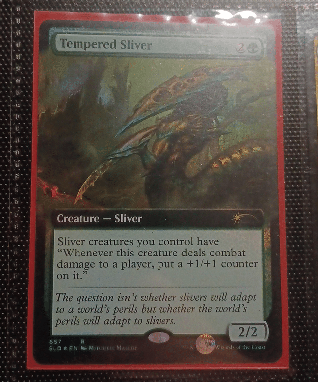 Another Reddit user, u/SiletheSilent, is showing off a Tempered Sliver acquired by a friend. If anything is clear at this point, Slivers aren’t coming from any particular Secret Lair. Any of the ones being mailed out right now (this one was from the Neon Ink Kamigawa Neon Dynasty Secret Lair) have a chance of sporting one of these Slivers. However, they seem rare enough that these are still popping out of the woodwork. It’s too early to tell how rare each individual Sliver will be. This also makes it difficult to put a price tag on these, but I expect them to be worth at least $70 (but probably more).