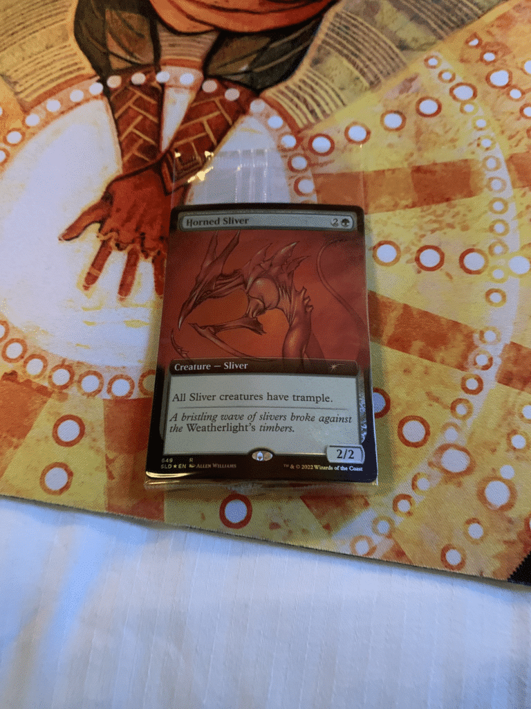 Horned Sliver was the first instance of these chase cards announced by @BenMakesStuff when he got the early copies of the Secret Lair. Trample is an essential keyword when you aim to send a bunch of powered-up Slivers to end your opponents.