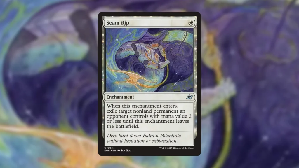 Most of the time, this final update just reveals common and uncommon Draft chaff. This time around, however, there are a few cards that are definitely worth paying attention to. One of these cards, Seam Rip, resembles a card that’s currently competitive enough to see Modern play. We’re a bit unsure why Wizards didn’t spoil Seam Rip with more fanfare. Nevertheless, in case you missed it, the card looks incredible.