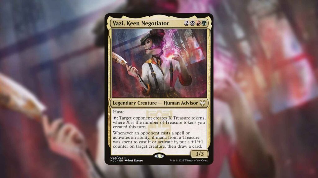 Once you have all this in place, Vazi, Keen Negotiator is able to truly shine. Granting opponents Treasures at opportune moments should keep anyone from getting ahead, all while you set up for an explosive turn to close out the game. Perhaps the best thing about Vazi, however, is that you’ll naturally generate a ton of advantage off other artifact token Commanders that use Treasures, Clues, or Food themselves. These are extremely common at Bracket 3 Commander tables, allowing Vazi to overperform.
