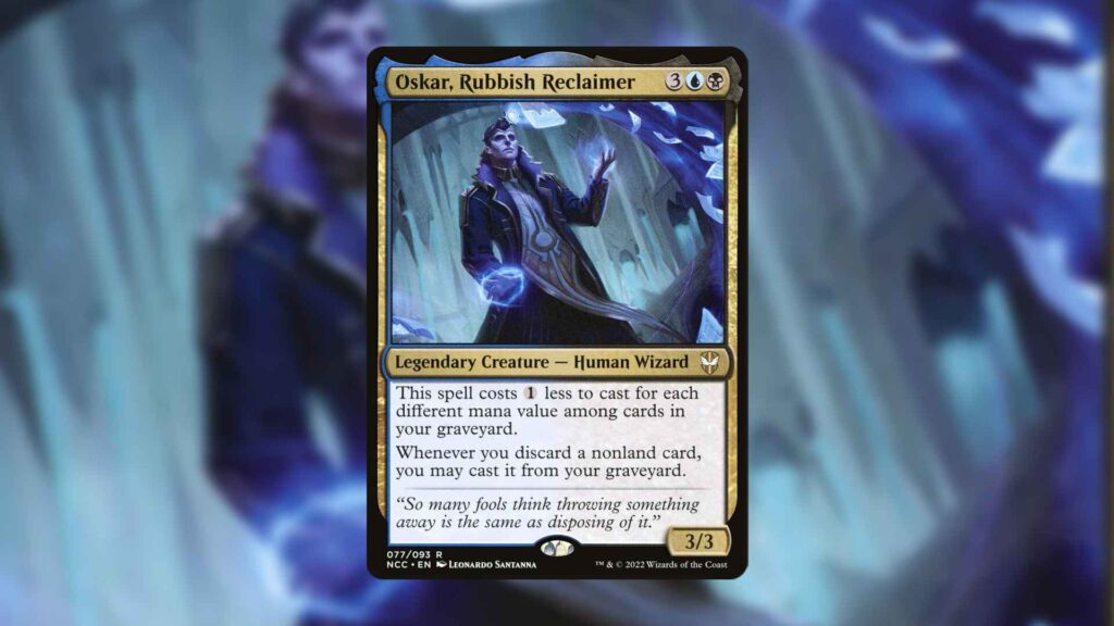 Oskar, Rubbish Reclaimer may cost five mana on paper, but you’ll rarely be paying full cost for this Commander. Thanks to casting discarded nonland cards, Oskar’s abilities naturally fuel oneanother. Even if you don’t use Oskar to cast your discarded cards, they will still work towards making Oskar cheap, allowing you to recast him easily.