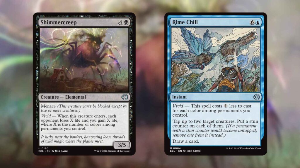 Thankfully, off-colored Hybrid creatures, particularly Changelings like Prideful Feastling, can help maximize Vivid across different two-colored archetypes. Rime Chill, for example, which felt like a notable power outlier, can commonly come down for four mana alongside some Hybrid Changelings. Shimmercreep can similarly do a great Siege Rhino impression, creating a three-life swing attached to a relevant body.