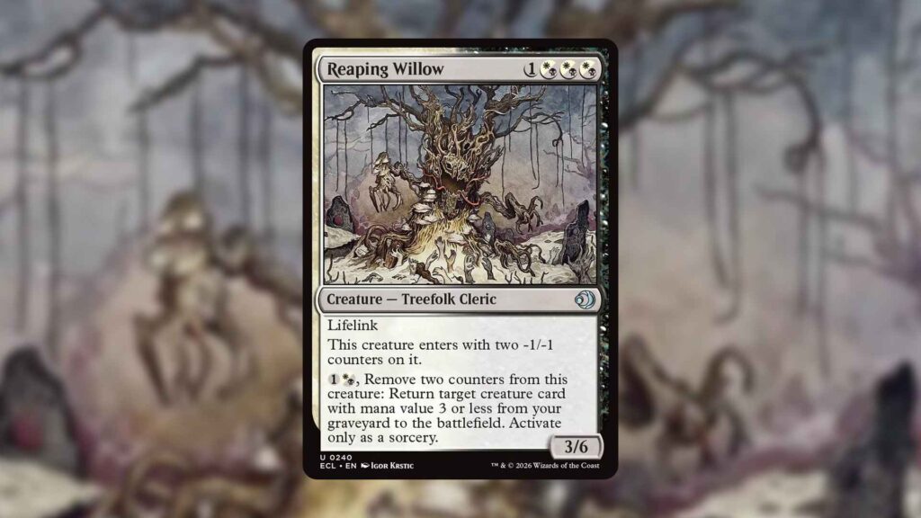 If you can manage to cast it, Reaping Willow is a beating. Offering a 3/6 Lifelinker that reanimates another creature, this Treefolk can take over the game quickly. As long as one of your core colors is black or white, this card is worth trying to play.
