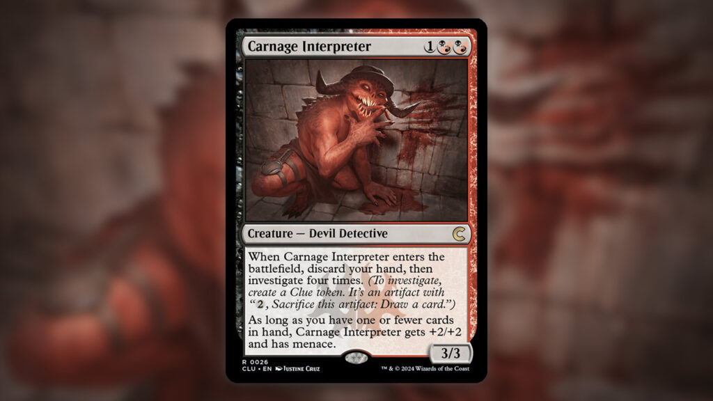 Why is Carnage Interpreter spiking in price? After being highlighted as a new inclusion in Magic Online’s somewhat controversial changes to the Vintage Cube, people appear to have started realizing that this card has been majorly slept on. Playing Carnage Interpreter with an empty hand provides an absurd amount of value. It doesn’t matter how many cards you discard. This Interpreter will always Investigate four times, and will be a 5/5 Menace creature for three most of the time. This is incredibly efficient for two player formats.