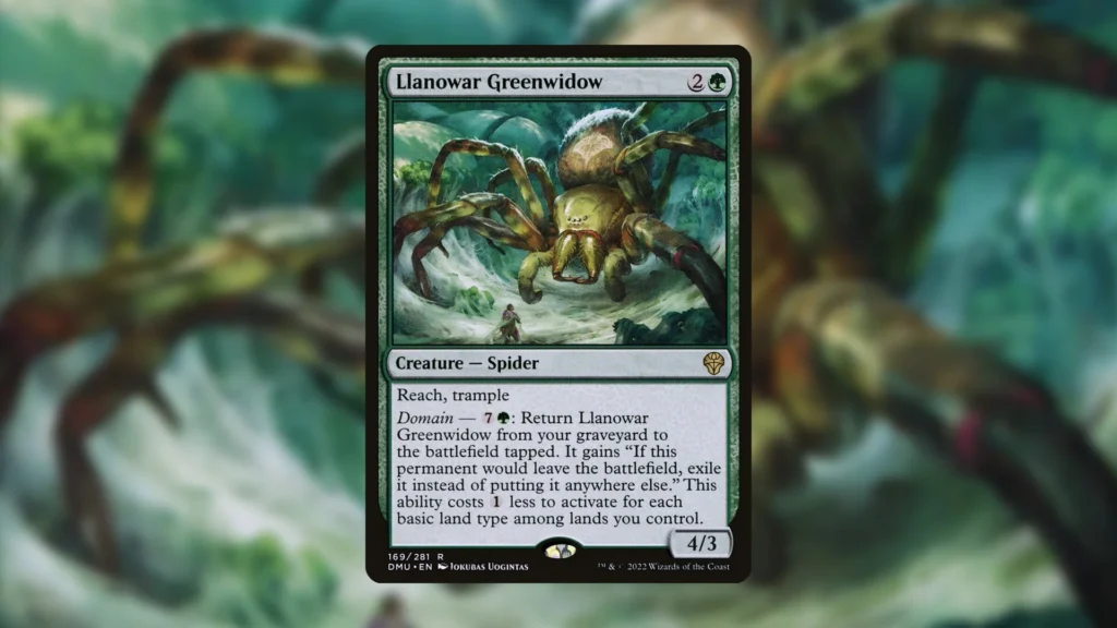 Llanowar Greenwidow is not the worst creature in the world. This three mana 4/3 with Reach and Trample plays really well in Domain decks. Should Llanowar Greenwidow die or enter the graveyard through other means, Llanowar Greenwidow can bring itself back once. Eight mana may seem like a lot, but with five different basic land types, this cost can be reduced to just three.