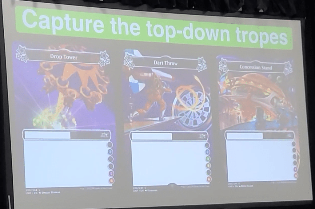 The picture above showcases a new type of card being introduced called Attractions. While Rosewater was not allowed to showcase the text of these cards, he did showcase the borders. These alone made it clear that Attractions are a new type of Magic card. We do not know where the legality of these cards will fall (but it looks like some might be Eternal legal?)