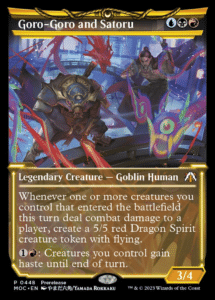 Do note that Goro-Goro and Satoru can even grant your creatures Haste, allowing you to cover some ground if cards you’re playing don’t synergize with the Legendary Creature’s abilities on their own. This makes the card an absolute house in a Sealed environment since it can create a 5/5 Dragon off of, basically, any creature that you cast.