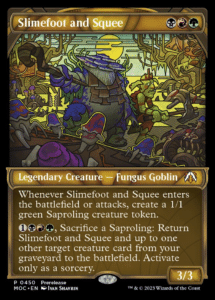 Slimefoot and Squee is the last potential Legendary Creature that you can open in your Prerelease kit that is not allowed to be used in your Sealed deck. This Commander legal card is incredibly difficult to deal with in a Prerelease setting. Not only is the card capable of creating multiple bodies when it enters the battlefield or attacks, but Slimefoot and Squee can sacrifice those bodies to resurrect themselves and create more.