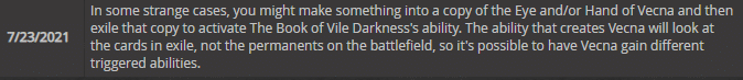 One of the official rulings from MTG’s The Book of Vile Darkness is pictured above. When creating Vecna, you need to have an Artifact named Eye of Vecna and an Artifact called Hand of Vecna. Once those artifacts are exiled for Vecna’s creation, they return to whatever they were before they entered the battlefield. Because Vecna cares about the triggered abilities of the exiled permanents, it’s possible to build a crazy version of Vecna by making other things with triggered abilities into temporary copies of Vecna’s pieces.