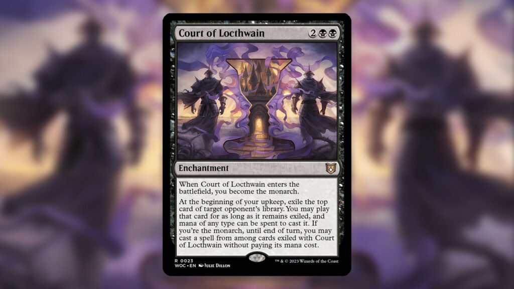 In the case of Court of Locthwain, this card offers you card advantage. The Court exiles cards from your opponents library and allows you to cast them with mana of any colors. Should you have Monarch, you can cast a spell exiled this way for free. Notably, you can only target one opponent at a time. Still, exiling and casting multiple free spells from your opponents per turn is massive.