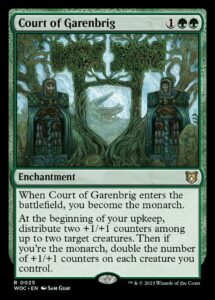 Granted, it’s probably three mana, draw a single card end of turn for Monarch, then someone steals Monarch from you. Sure. But then it’s accruing you value every turn until you do seize the Monarch for a turn and then double all your +1/+1 counters and win the game. Three mana is an excellent deal for that potential value and green decks tend to run lots of creatures so keeping the Monarch can be easy.