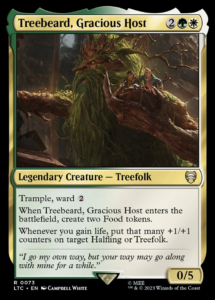 Treebeard offers a nice mix of abilities that benefit a Food strategy, but is equally strong in a deck focused on lifegain. In addition to offering Food, Treebeard can put +1/+1 counters on itself (and other Hobbits/Treefolk you control) equal to the amount of life you gain. Treebeard offers six life with the Food tokens it creates, which is sort of a 6/11 for eight mana at worst.