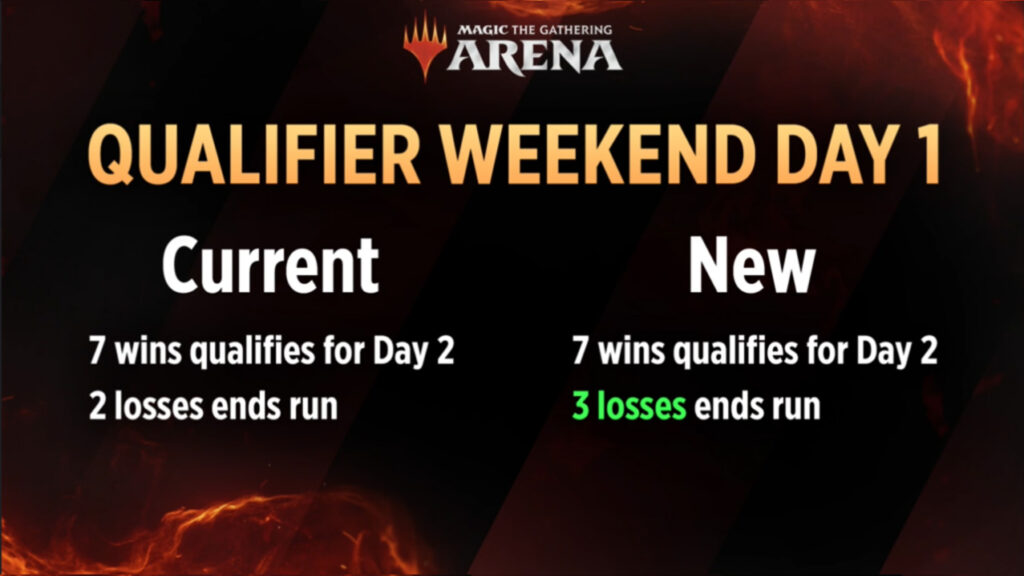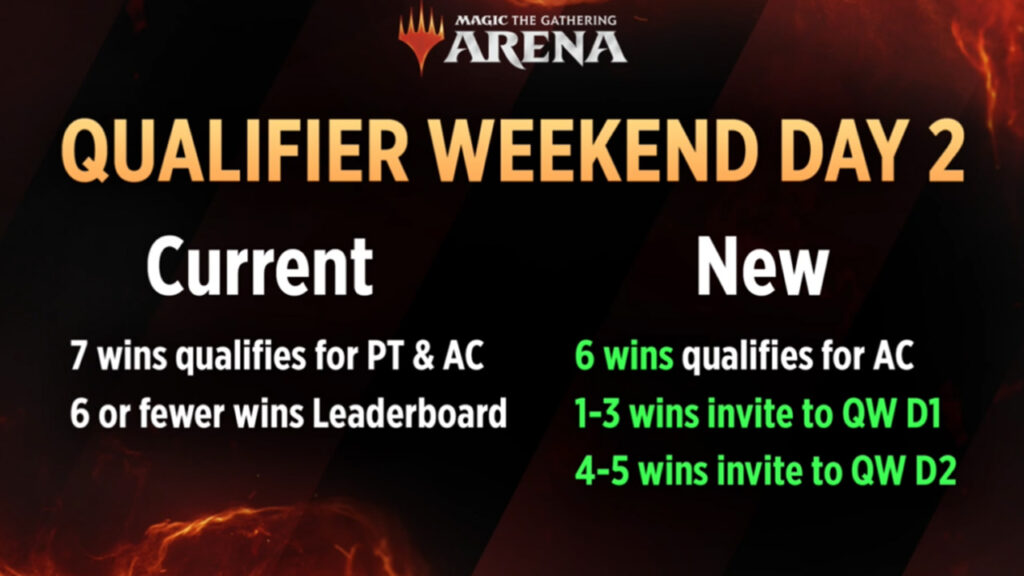 While the number of losses granted remains a bit unclear for day 2 of the MTG Arena Qualifier Weekend Events (it looks like only one loss), players now only need six wins to qualify for the Arena Championship.