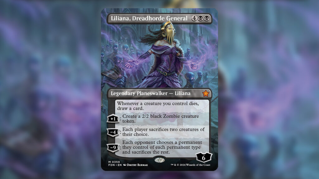 While Liliana is too expensive to see any constructed play in the formats that she is legal in, Liliana, Dreadhorde General is a powerhouse in the Commander format. Her static ability can generate ludicrous amounts of value if you have any aristocratic synergies in your deck. Otherwise, board wipes will also refill your hand, allowing you to keep up with the table. Combine this with a devastating ultimate ability, a plus ability that essentially acts as card advantage, and a -4 that can generally deal with a problematic threat, while drawing two cards in a Commander game, and Liliana is incredibly powerful.