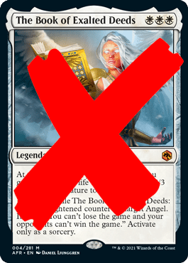 The reasoning behind this banning is that the combination of the Book of Exalted Deeds and Faceless Haven was a frustrating thing to play against. The deck didn’t command any crazy win percentages or metagame share, but that interaction created unfun game states, with very little recourse for those who play against it. Since the Standard 2022 queue is Best of 1, you can’t sideboard against the combo, and thus it is banned.