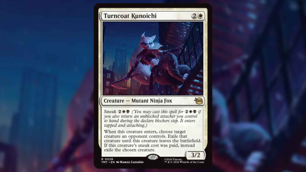 While nearly every rare and mythic appeared over the weekend thanks to the prerelease debacle, one final rare somehow avoided the spotlight until now. Turncoat Kunoichi looks like another classic piece of exile removal attached to a white creature. The flexibility is interesting here, awarding players who pay the harsher Sneak cost with unconditional removal. This could allow the Mutant Ninja Fox to see play in some dedicated Ninjutsu and Panharmonicon strategies that can reliably present unblockable creatures. Even without that, Turncoat Kunoichi has some potential.