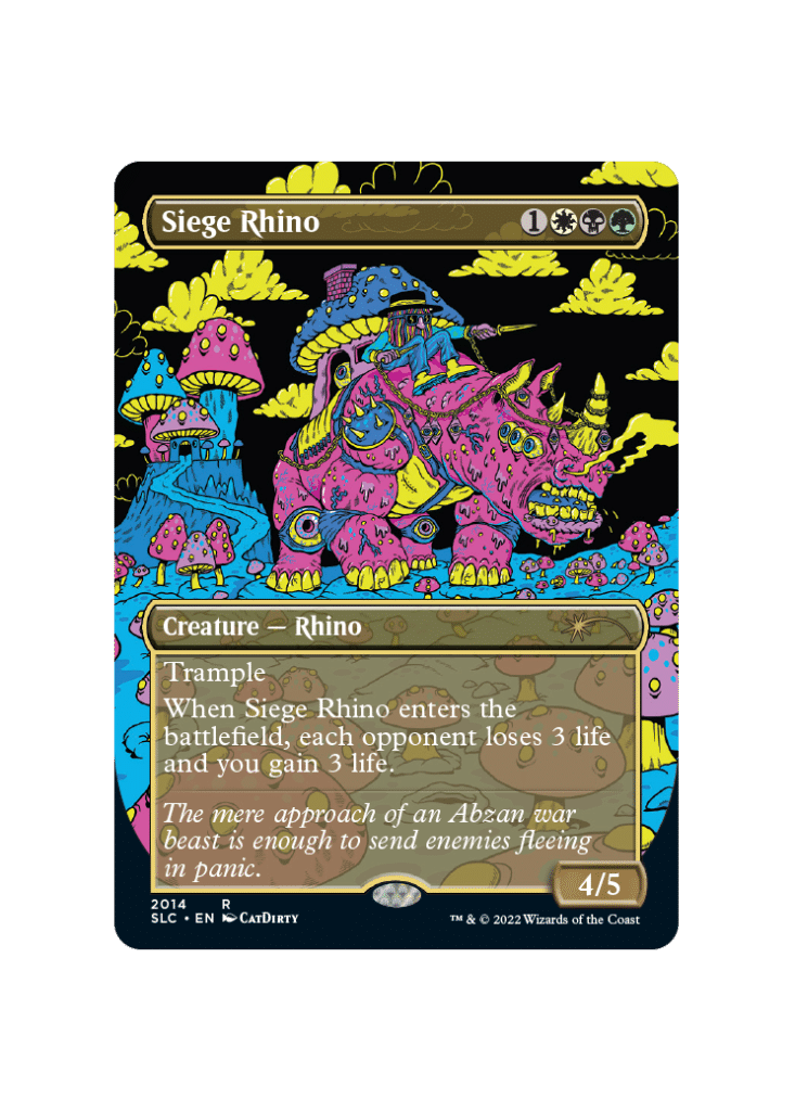 It looks like a lot of these cards have some competitive history. Siege Rhino isn’t worth anything now, but the card was a force to be reckoned with back when it was legal in Standard. Abzan Midrange became a prevalent force in the metagame that was almost entirely focused on resolving Siege Rhino. It is incredibly similar, yet underpowered, version of Sheoldred, the Apocalypse from Dominaria United. This is another example of how much power creep has affected MTG over the years.