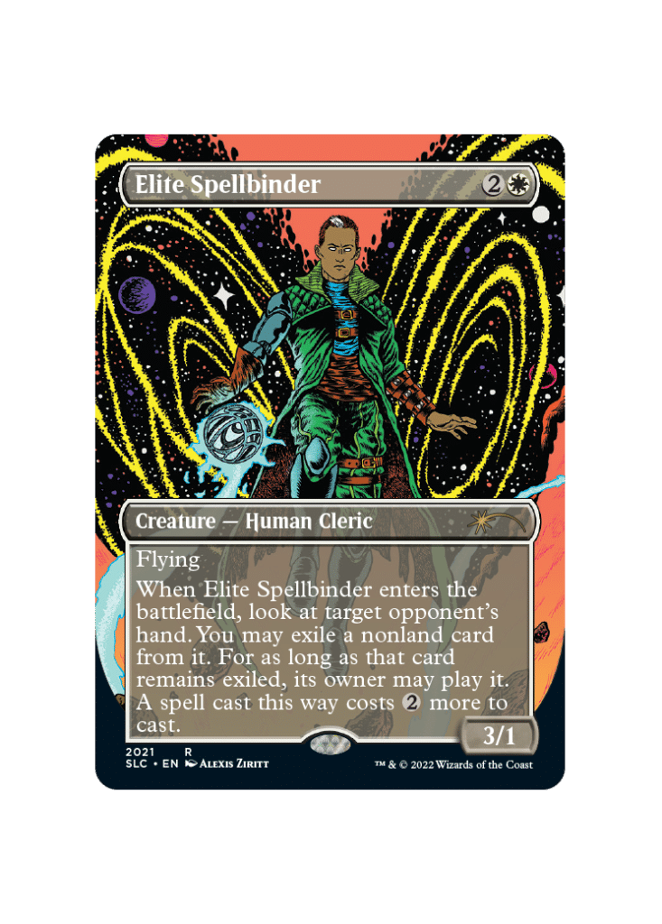 This was part of a series of cards based initially on an MTG World Champion’s design. Paul Vitor Damo Da Rosa was the 26th MTG World Champion and had this card and artwork based on his likeness. Elite Spellbinder saw a ton of Standard play pre-rotation.
