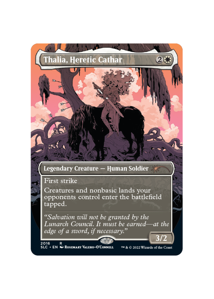Thalia, Heretic Cathar is a great flex option available for Mono-White Aggro decks in Pioneer. This card sports a body with keywords that are powerful on the ground while also taxing slower strategies, giving you more time to close the game out. As an aside, this is my favorite artwork in the whole Secret Lair.