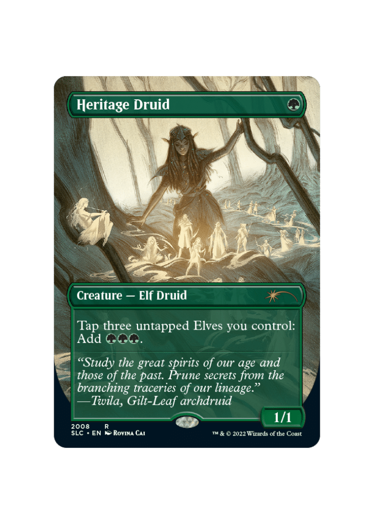 Heritage Druid enables the go-wide Elf tribal decks to play out extremely fast. This card does not require Elves to not be summoning sick when tapping them for its ability. This allows Heritage Druid to ignore the one-turn delay we usually see with mana dorks like Llanowar Elves. This combos insanely well with Nettle Sentinel and Glimpse of Nature, a banned card also available in this Secret Lair.