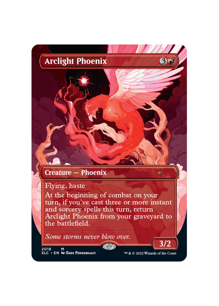 This card may have a significant premium for being a full-art version. Arclight Phoenix is a hyper-competitive staple that has been relevant in multiple formats competitively throughout its history. It currently has a home in Arena-only formats and Pioneer as a sort of Combo/Tempo deck. This card saw a recent reprint in the 2022 Pioneer Challenger decks, so expect the price of Arclight Phoenix to fluctuate heavily in the coming days. This card is strong enough to push for the ban of other MTG cards in formats like Faithless Looting and Brainstorm.