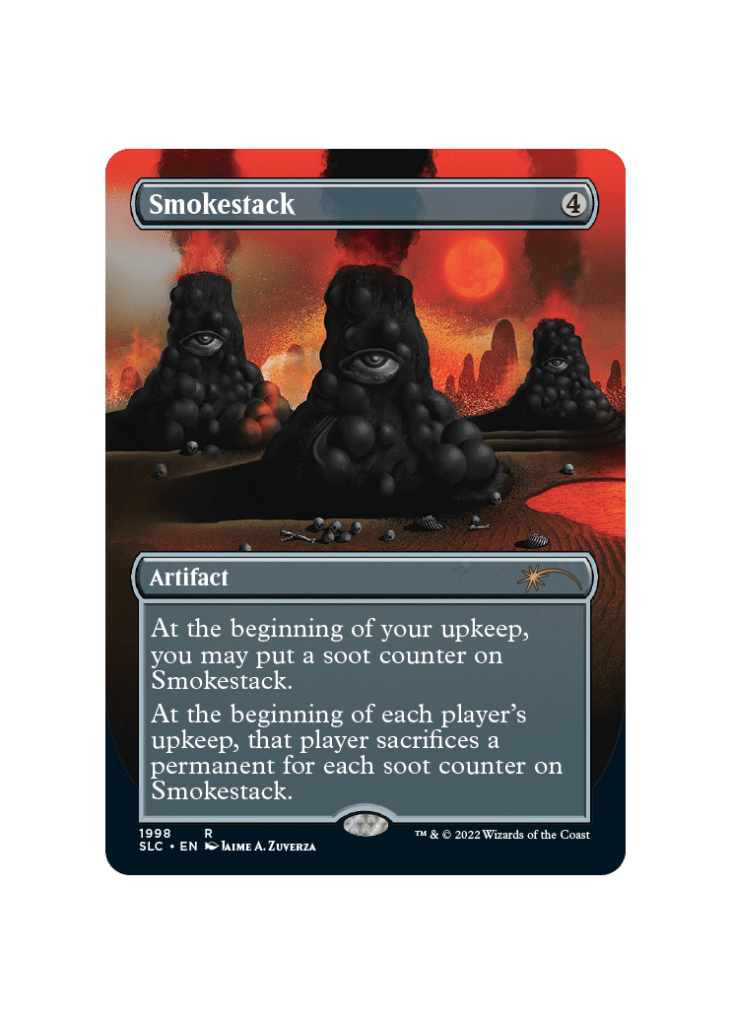 Welcome to what may potentially be one of the most infamous cards in all of MTG history. Smokestack is the namesake of one of, if not the most hated strategies in all of MTG – Stax. This strategy uses multiple effects to slow the game down to a snail’s pace. At this modified speed, the Stax player uses effects to break the devastating parity that many of the Winter Orb-esque effects provide. Smokestack can create a board state where players cannot keep any permanents on the board for more than one turn, including lands.