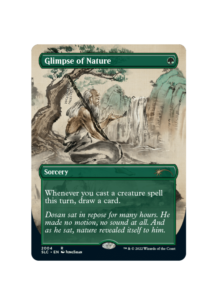 Here we have yet another card on the banned list of some formats! Glimpse of Nature is capable of creating situations where one can draw out their entire deck by playing some small creatures. With a single bounce spell to recur creatures like Cloudstone Curio, Glimpse of Nature can quickly draw an entire deck while floating infinite mana. As mentioned earlier, this is incredibly powerful with Heritage Druid and can end games quickly in Elf shells as early as turn one in extreme scenarios!