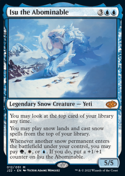 Isu the Abominable is a five-mana 5/5 that looks to be a fantastic Bant snow Commander! This creature accumulates card advantage by casting snow permanents off the top of your library. It can also act as a win condition by threatening Commander damage! I don’t think this will break any formats, but it is a fun new Commander to build around.