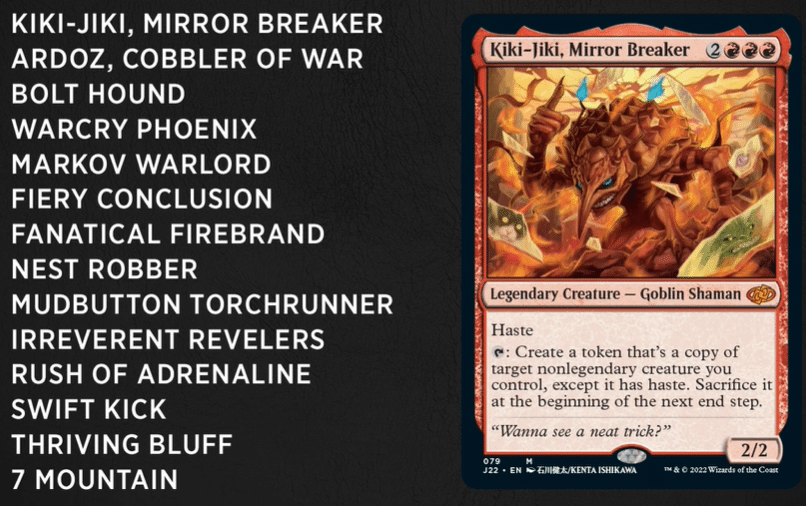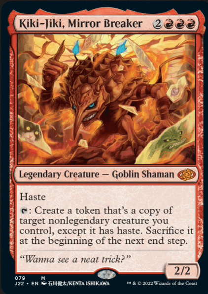 A fan-favorite Legendary Creature is getting another reprint and new artwork in this set! Kiki-Jiki is best known (besides maybe by his Legacy in Neon Dynasty) for perpetuating a bunch of infinite combos. This card still sees Modern play in Goblins, which can cause a Conspicuous Snoop to create infinite copies of itself.