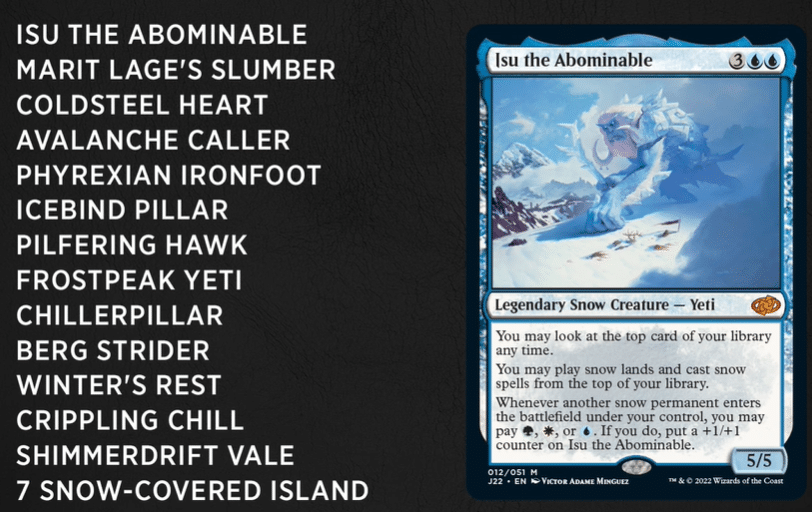 Isu the Abominable is a five-mana 5/5 that looks to be a fantastic Bant snow Commander! This creature accumulates card advantage by casting snow permanents off the top of your library. It can also act as a win condition by threatening Commander damage! I don’t think this will break any formats, but it is a fun new Commander to build around.