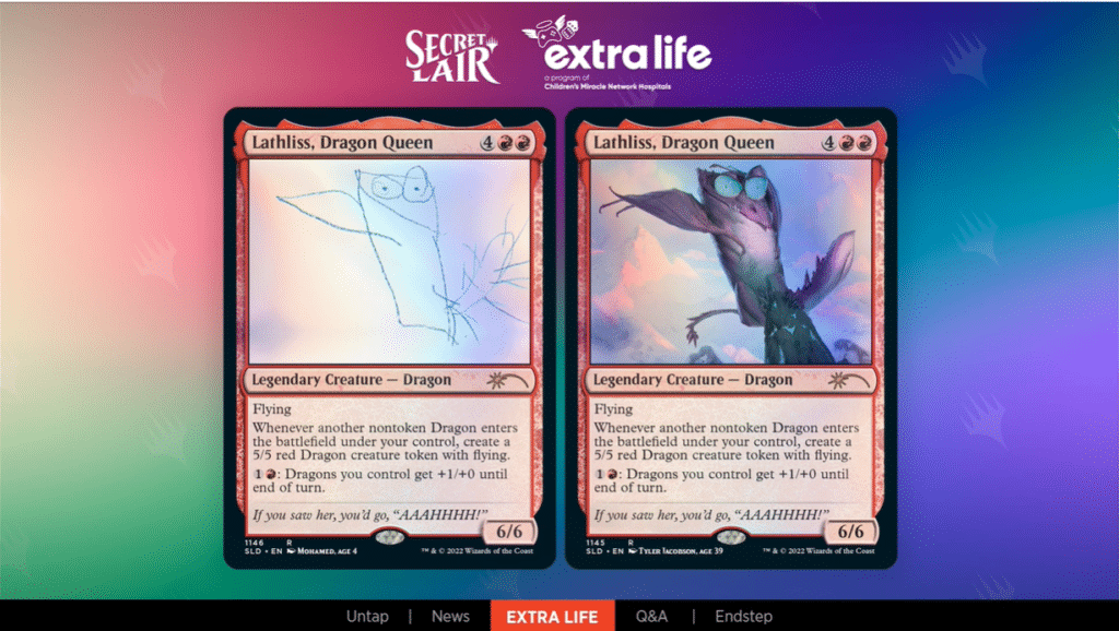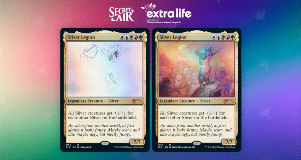 As shown in the picture above, the upcoming Secret Lair showcases three artworks made by kids that MTG artists will bring to life. Considering that you get two copies of each card in these lairs, the value is usually more than worth the price of these. Better yet, it’s all for charity!