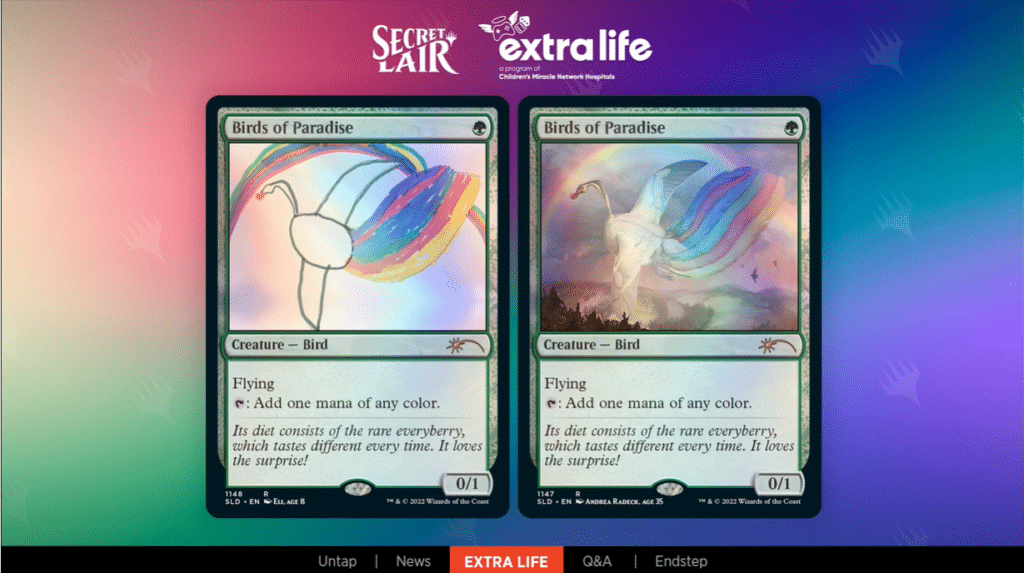 This reveal’s primary focus was another installment of Wizards of the Coast’s partnership with Extra Life. Extra Life is hosting a variety of charity incentives to raise money and help those in need. To do this, besides donating directly, there are a few charity products in the form of Secret Lairs and MTG Arena Cosmetics!