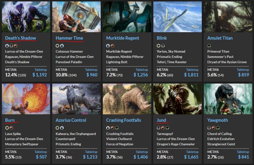 As you can see from the above snapshot of the Modern metagame taken before the B&R announcement, 4 out of the top 10 Modern decks used Lurrus as a companion.