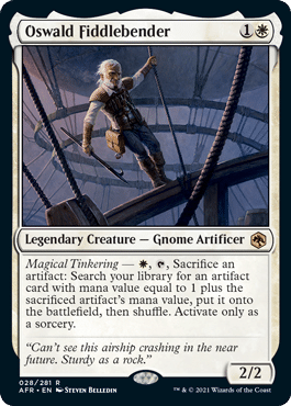 In MTG, Oswald Fiddlebender a White Legendary Creature Gnome Artificer who costs two mana and is a 2/2. Their ability allows you to pay one White mana and tap them to, “Sacrifice an Artifact: Search your library for an Artifact card with mana value equal to one plus the sacrificed Artifact’s mana value. Put that card onto the battlefield, then shuffle. Activate only as a sorcery.”