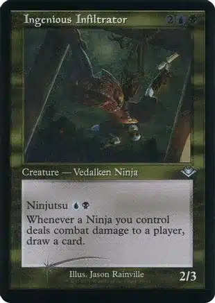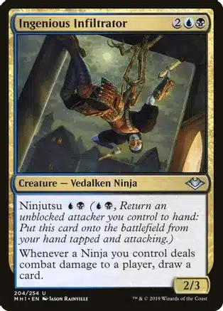 Ingenious Infiltrator is like a better Ninja of the Deep Hours. It can draw a card when it deals combat damage to a player. But it gives all of your ninjas the same ability, offering some serious card advantage.