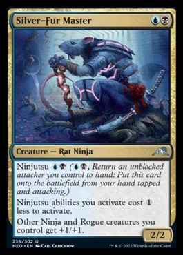 Silver-Fur Master is at its best in a Ninja tribal deck like Yuriko, the Tiger’s Shadow. He’ll buff all of your Ninjas. And on top of that, it reduces all of their ninjutsu costs.
